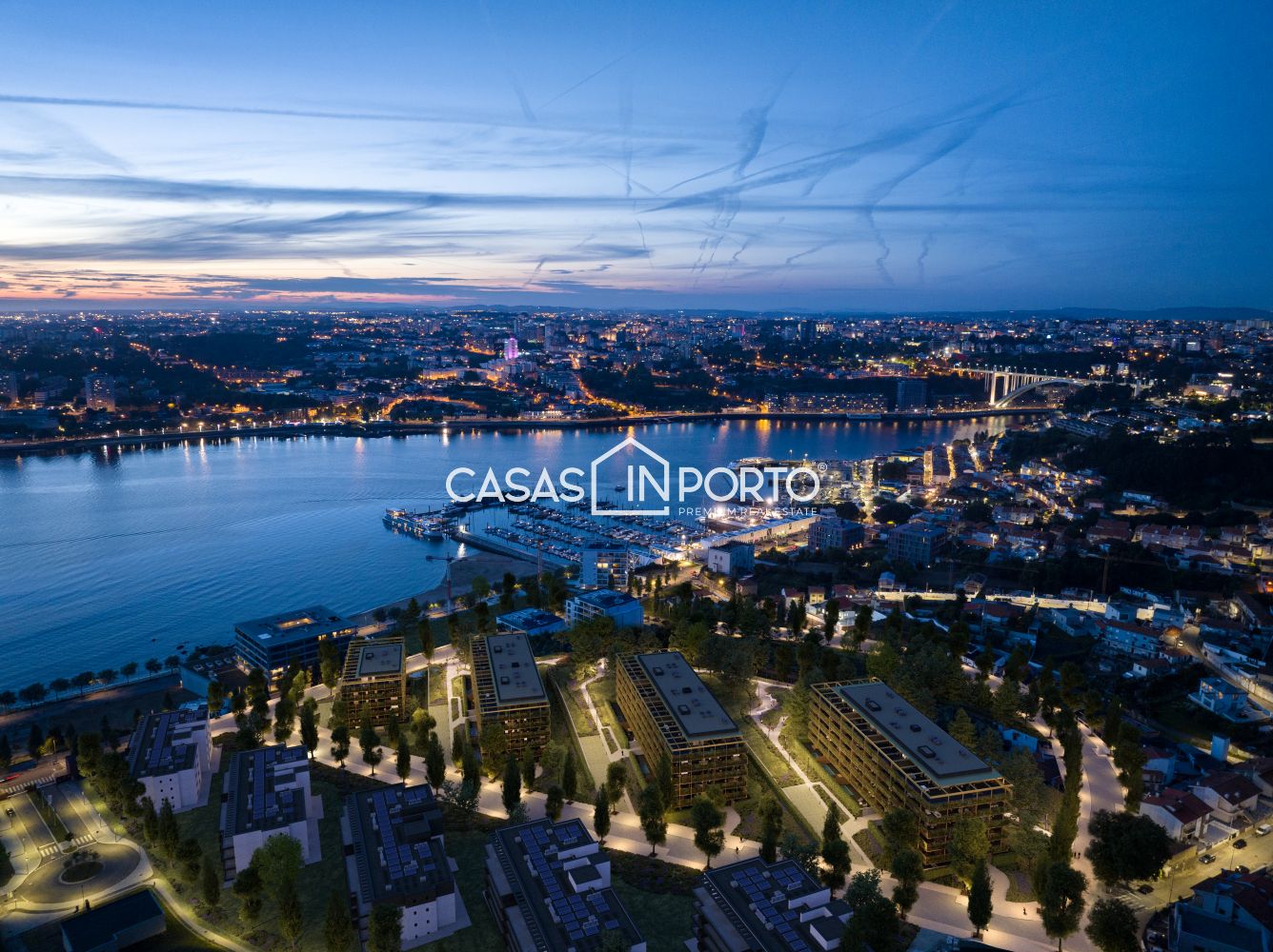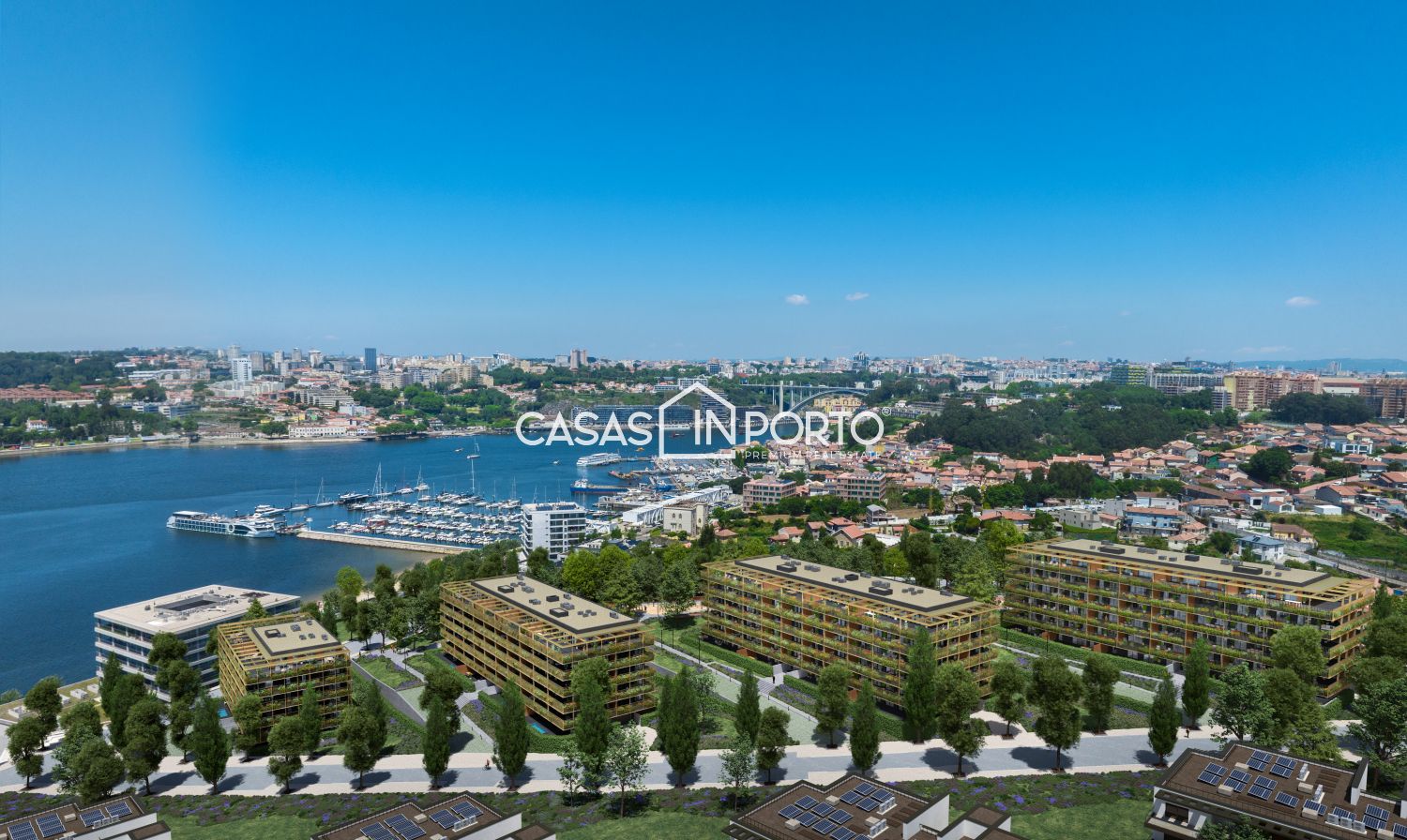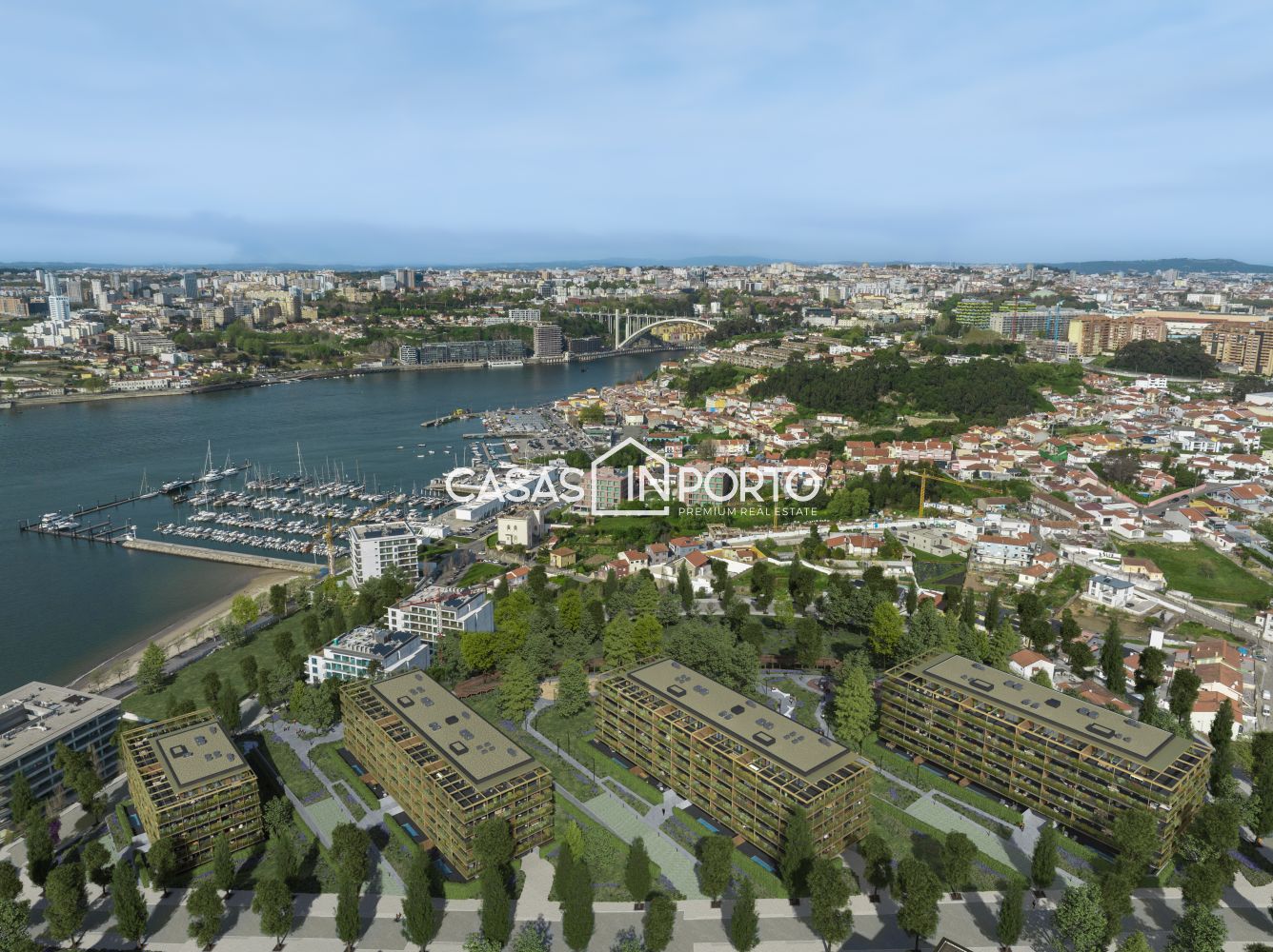 Edifício "Portas do Mar" Sofisticação e Tecnologia sobre o Rio Douro Localizado na margem sul do rio, junto à Marina da Afurada, este empreendimento combina uma arquitetura contemporânea com soluções tecnológicas de última geração para garantir o máximo conforto e segurança. Conforto Térmico e Sustentabilidade A climatização e a eficiência energética foram priorizadas em cada detalhe das habitações: - Climatização: Sistema multi-splits com unidades murais interiores Deluxe da LG (ou equivalente) para aquecimento e arrefecimento. - Águas Sanitárias: Aquecimento assegurado por bomba de calor de alta eficiência, tipo Ariston. - Ventilação: Sistemas mecânicos individuais e independentes em cada cozinha e instalações sanitárias. - Isolamento: Caixilharia de alumínio com rutura térmica (tipo Cortizo Cor Vision e Cor 70), equipada com vidros duplos de proteção solar e térmica. - Estores: Estores exteriores elétricos em alumínio tipo "Controlsol CS 55". Design de Interiores e Acabamentos O interior das habitações reflete um design minimalista e funcional: - Carpintarias: Portas interiores de batente ou de correr até ao teto, com faces esmaltadas e dobradiças ocultas. - Segurança: Porta de segurança na entrada das habitações tipo Portrisa Power ou equivalente. - Cozinhas e Banhos: Espaços equipados com eletrodomésticos Bosch, tampos em granito Negro Angola e louças suspensas Geberit. Áreas Comuns e Equipamentos O condomínio oferece uma infraestrutura completa pensada para a vida moderna: - Lazer Exterior: Arranjo paisagístico que inclui parque infantil, zonas de estar, espelho d'água e passadiços de madeira. - Segurança e Acessos: Sistema de vídeo porteiro a cores, CCTV nas zonas comuns do rés-do-chão e controlo de incêndios e monóxido de carbono nas garagens. - Mobilidade: Elevadores Schindler com capacidade para 8 pessoas, silenciosos e energeticamente eficientes. - Garagem e Resíduos: Parque privativo com portão seccionado automático e ecopontos no passeio de acesso para recolha seletiva. Localização Privilegiada A localização estratégica permite desfrutar de uma ciclovia de 6 km junto à porta de casa, ligando a habitação à Reserva Natural do Estuário do Rio Douro e às praias, além da proximidade ao Arrábida Shopping e a colégios de referência. CASAS IN PORTO - THE BEST IN CLASS