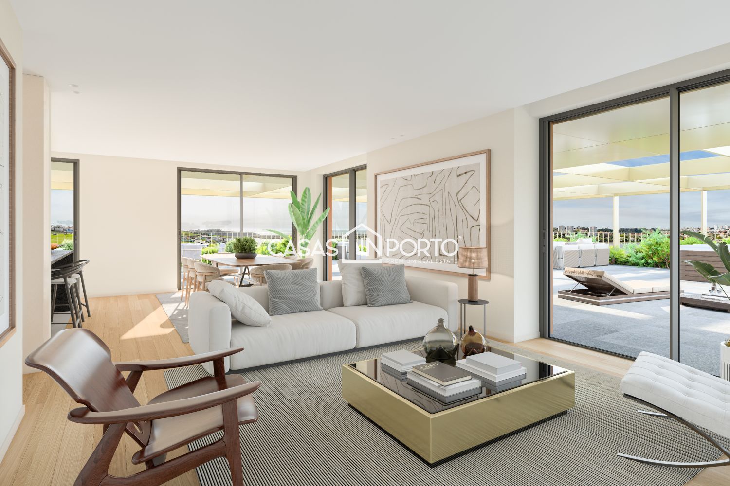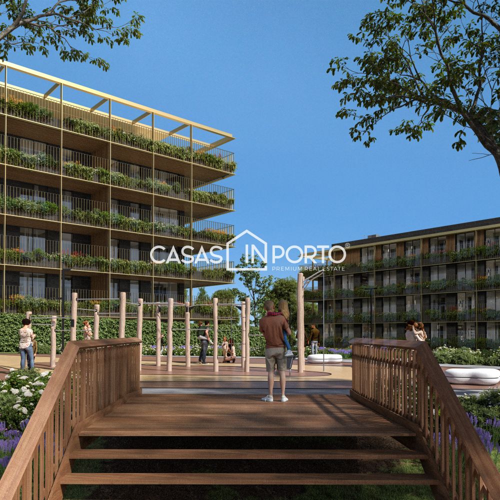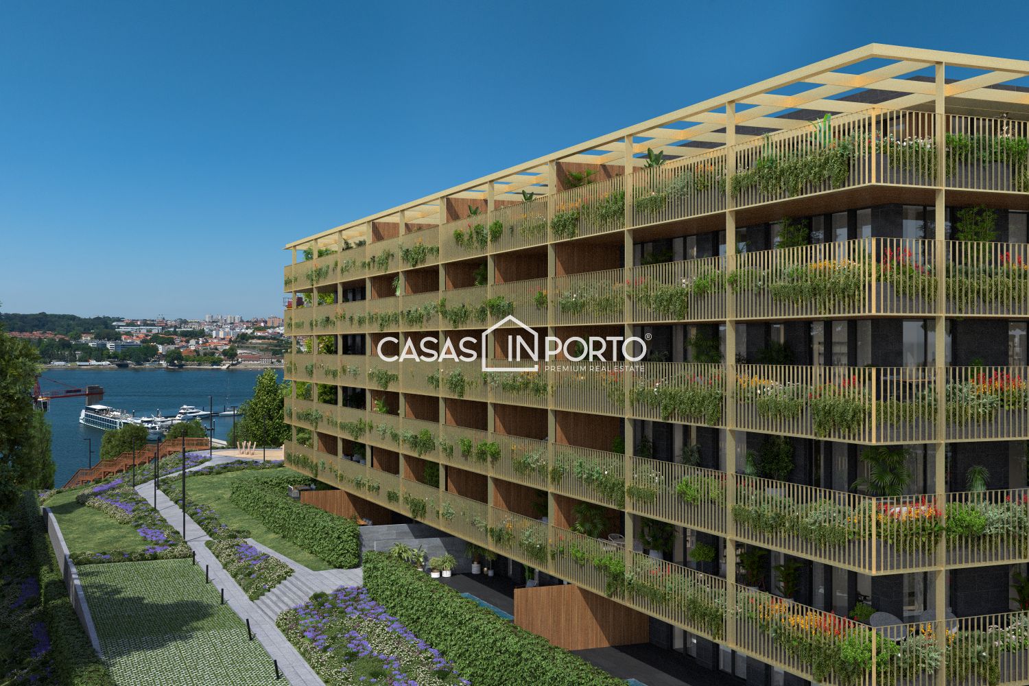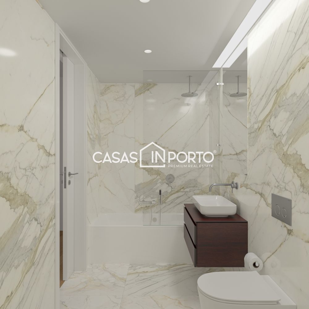 Edifício "Portas do Mar" Sofisticação e Tecnologia sobre o Rio Douro Localizado na margem sul do rio, junto à Marina da Afurada, este empreendimento combina uma arquitetura contemporânea com soluções tecnológicas de última geração para garantir o máximo conforto e segurança. Conforto Térmico e Sustentabilidade A climatização e a eficiência energética foram priorizadas em cada detalhe das habitações: - Climatização: Sistema multi-splits com unidades murais interiores Deluxe da LG (ou equivalente) para aquecimento e arrefecimento. - Águas Sanitárias: Aquecimento assegurado por bomba de calor de alta eficiência, tipo Ariston. - Ventilação: Sistemas mecânicos individuais e independentes em cada cozinha e instalações sanitárias. - Isolamento: Caixilharia de alumínio com rutura térmica (tipo Cortizo Cor Vision e Cor 70), equipada com vidros duplos de proteção solar e térmica. - Estores: Estores exteriores elétricos em alumínio tipo "Controlsol CS 55". Design de Interiores e Acabamentos O interior das habitações reflete um design minimalista e funcional: - Carpintarias: Portas interiores de batente ou de correr até ao teto, com faces esmaltadas e dobradiças ocultas. - Segurança: Porta de segurança na entrada das habitações tipo Portrisa Power ou equivalente. - Cozinhas e Banhos: Espaços equipados com eletrodomésticos Bosch, tampos em granito Negro Angola e louças suspensas Geberit. Áreas Comuns e Equipamentos O condomínio oferece uma infraestrutura completa pensada para a vida moderna: - Lazer Exterior: Arranjo paisagístico que inclui parque infantil, zonas de estar, espelho d'água e passadiços de madeira. - Segurança e Acessos: Sistema de vídeo porteiro a cores, CCTV nas zonas comuns do rés-do-chão e controlo de incêndios e monóxido de carbono nas garagens. - Mobilidade: Elevadores Schindler com capacidade para 8 pessoas, silenciosos e energeticamente eficientes. - Garagem e Resíduos: Parque privativo com portão seccionado automático e ecopontos no passeio de acesso para recolha seletiva. Localização Privilegiada A localização estratégica permite desfrutar de uma ciclovia de 6 km junto à porta de casa, ligando a habitação à Reserva Natural do Estuário do Rio Douro e às praias, além da proximidade ao Arrábida Shopping e a colégios de referência. CASAS IN PORTO - THE BEST IN CLASS
