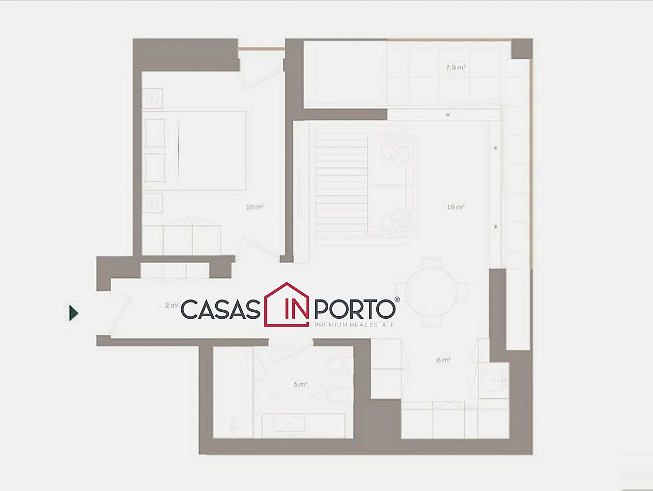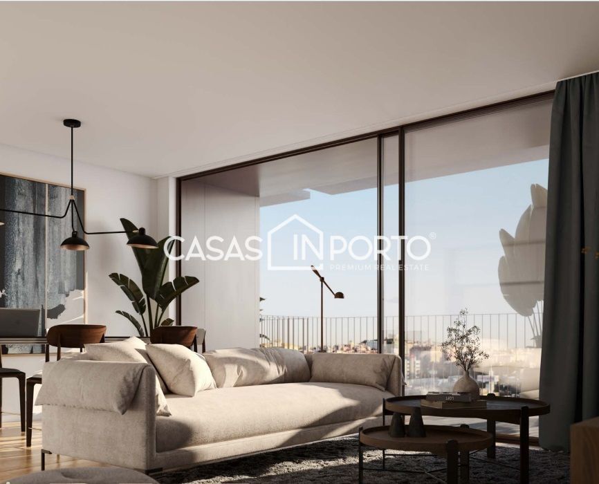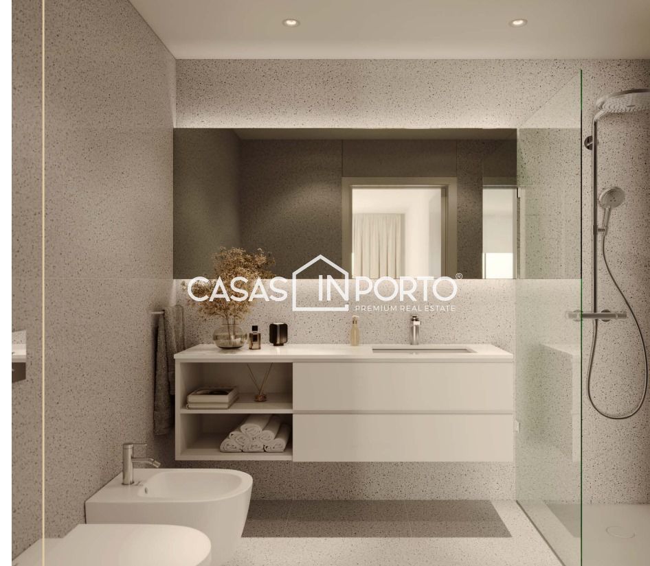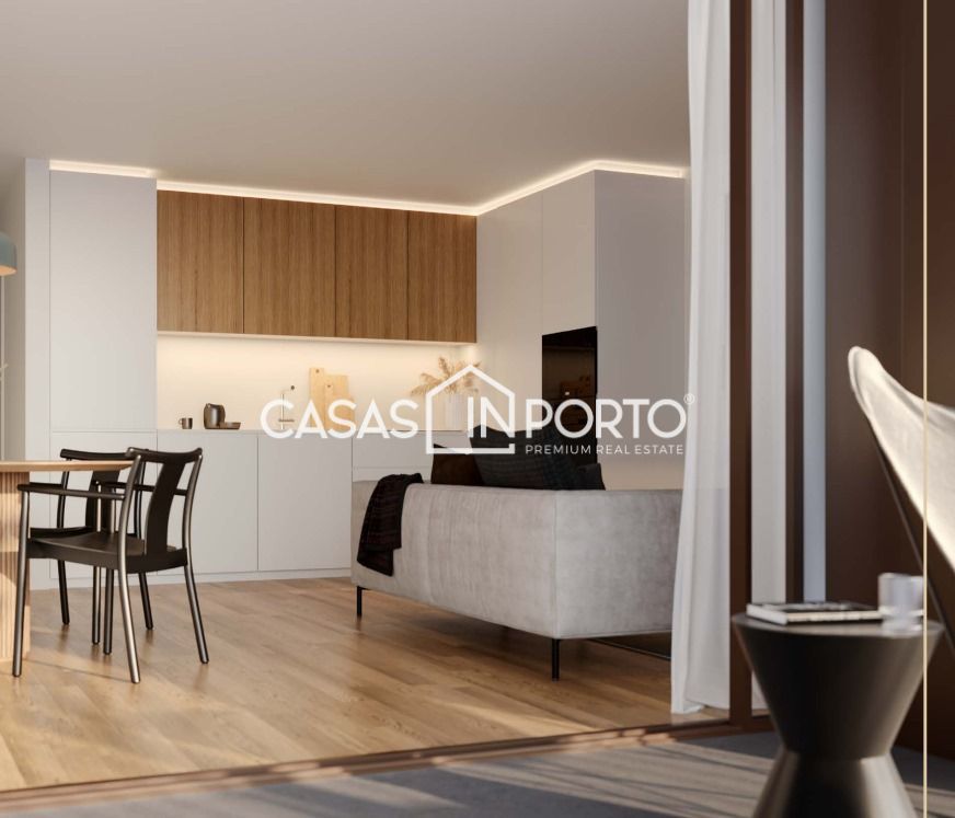 Apartamento T1 com varanda e garagem. Apartamento com 54, 5 m2, com varanda e garagem. Orientação solar Nascente/ Norte. Apartamento bem dividido e com áreas generosas. Muita arrumação. Excelente luminosidade. EXTERIOR REVESTIMENTO FACHADA E VARANDAS Estrutura em betão pré-fabricado à vista e paredes com revestimento orgânico à base de granulado de mármore do tipo WEBERPLAST STONE; Revestimento de armários técnicos de varandas em STACBOND ou equivalente e gradil à mesma cor; CAIXILHARIAS Caixilharia de alumínio com corte térmico e sistema minimalista tipo REYNAERS ou equivalente; ESTORES Blackouts de rolo interior motorizados nos quartos, tipo CONTROLSOL ou equivalente; PAVIMENTO - VARANDAS Pavimento em cerâmico sobre apoios; GUARDAS Guardas metálicas em cor similar à caixilharia, constituída por prumos verticais e corrimão; INTERIOR - APARTAMENTOS PAVIMENTO Pavimento multicamada de madeira acabamento em madeira nobre, carvalho natural com tratamento a óleo ou verniz incoloro, colado; PAREDES e TETO Paredes e tetos em gesso cartonado pintado; RODAPÉ Rodapé em MDF lacado; PORTAS E ARMÁRIOS INTERIORES Portas com acabamento lacado; INTERIOR - COZINHAS PAVIMENTO Dependendo da tipologia, pavimento em cerâmico do tipo FLORIM, Cerim Castello ou pavimento multicamada de madeira; BANCADA Compacto de quartzo, do tipo SILESTONE, com arestas biseladas, com acabamento amaciado (mate); MÓVEIS Aglomerado hidrófugo com acabamento termolaminado; EQUIPAMENTOS Marca SIEMENS ou equivalente; Forno, Placa de Indução, Frigorífico Combinado, Exaustor/hotte, Máquina de Lava-louça; TORNEIRA Misturadora monocomando de lava loiça do tipo BRUMA Ginger, com acabamento cromado; LAVA-LOUÇA Pio lava-louça de encastrar por baixo do tipo TEKA Be Linea, com acabamento em aço inoxidável; INTERIOR - INSTALAÇÕES SANITÁRIAS PAVIMENTO e PAREDES Cerâmico do tipo REVIGRÉS Elements Mist Soft ou equivalente; LOUÇAS Sanita e bidé suspensa SANINDUSA série Urb.y ou equivalente, cor branca; Placa de comando do tipo OLI, série Slim, com acabamento cromado ou equivalente; Base de duche RESTONE ou equivalente com resguardo em vidro temperado; MÓVEIS Armário composto por frentes de gavetas/prateleiras em aglomerado hidrófugo com acabamento termolaminado; LAVATÓRIO Lavatório de encastrar por baixo SANINDUSA ou equivalente, em cerâmica branca; Tampo em compacto de quartzo ou similar, acabamento amaciado (mate); TORNEIRAS Serie Leaf da BRUMA acabamento cromado ou equivalente; EQUIPAMENTOS CLIMATIZAÇÃO Ar condicionado em todas as frações; AQUECIMENTO DAS ÁGUAS SANITÁRIAS Bomba de calor; VIDEOPORTEIRO Videoporteiro com ligação Wifi CASAS IN PORTO - THE BEST IN CLASS